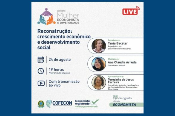 Como parte da programação do Mês do Economista, no dia 24 de agosto, a Comissão Mulher Economista e Diversidade, do Cofecon, realizará uma live, com o tema “Reconstrução: crescimento econômico…