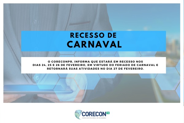 Conselho Regional de Economia 6ª Região/Paraná – CoreconPR, informa que estará em recesso nos dias 24, 25 e 26 de fevereiro, em virtude do feriado de Carnaval e retornará suas atividades no dia 27 de fevereiro. CoreconPR