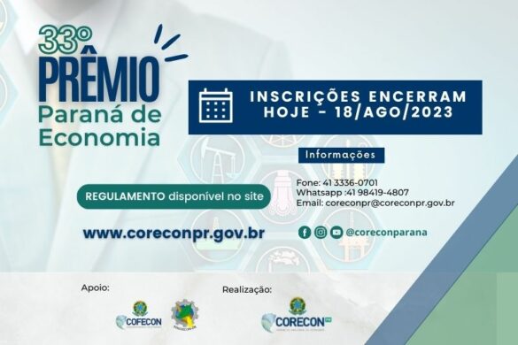O Conselho Regional de Economia do Paraná (CoreconPR) está encerrando hoje (18/08) as inscrições para o 33º Prêmio Paraná de Economia. O evento, realizado anualmente pela entidade, tem como objetivo…