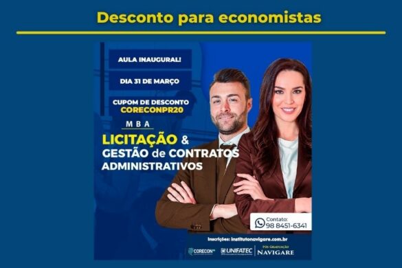 Economistas registrados no CoreconPR têm 20% de desconto no curso de MBA Licitação e Gestão de Contratos Administrativos do Instituto Navigare, do Instituto Navigare, usando o cupom especial, CORECONPR20, na matrícula.…