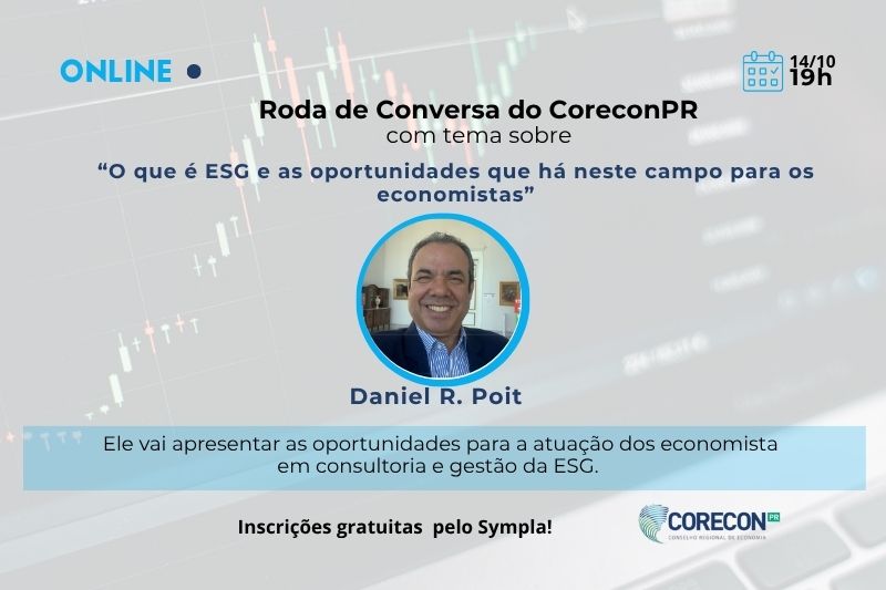 O Conselho Regional de Economia do Paraná (CoreconPR) promove, no dia 14 de outubro de 2025, às 19h, uma Roda de Conversa do CoreconPR com o tema “O que é ESG e as oportunidades que há neste campo para os economistas”, que será ministrada pelo economista Daniel R. Poit. O evento online é gratuito, com inscrições pelo Sympla e emissão de certificado.