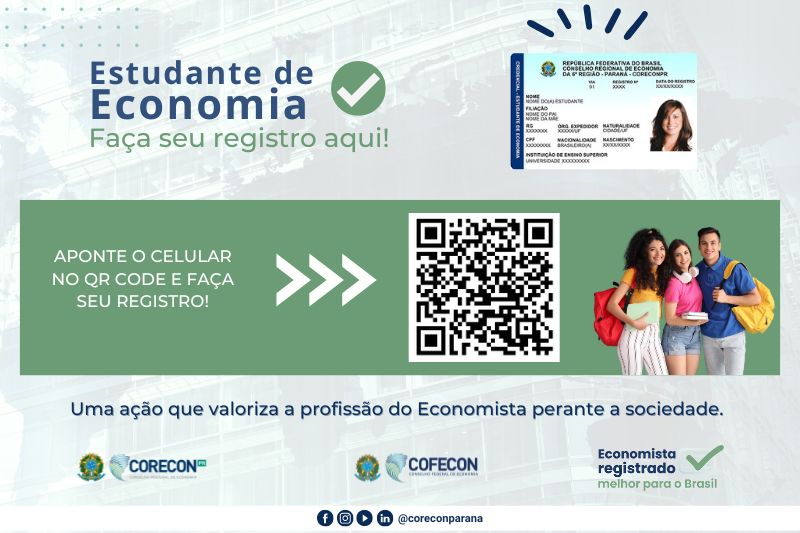 O Conselho Regional de Economia do Paraná (CoreconPR) conta com um serviço exclusivo para os estudantes de Ciências Econômicas do estado: o registro gratuito de estudante, realizado totalmente online. A iniciativa visa aproximar os futuros economistas do Conselho desde o período acadêmico, oferecendo uma série de vantagens e preparando-os para o exercício profissional.