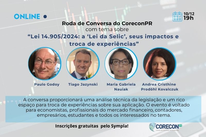 O Conselho Regional de Economia do Paraná (CoreconPR) promove no dia 10 de dezembro de 2025, às 19h, a Roda de Conversa do CoreconPR com o tema “Lei 14.905/2024: a ‘Lei da Selic’, seus impactos e troca de experiências”. O evento online e gratuito contará com a participação dos economistas Paulo Godoy, Tiago Jazynski, Maria Gabriela Nauiak e Andrea Cristhine Prodöhl Kovalczuk. As inscrições devem ser realizadas pelo Sympla, com emissão de certificado.