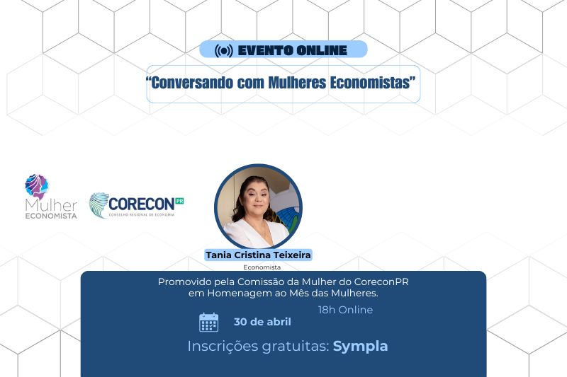 A Comissão Mulher Economista do CoreconPR tem o prazer de anunciar o terceiro encontro do projeto “Conversando com Mulheres Economistas”. O evento acontecerá no dia 30 de abril, às 18h, em formato online. A convidada especial desta edição será a Econ. Tania Cristina Teixeira, atual Presidente do Conselho Federal de Economia (Cofecon). Com uma trajetória de destaque na profissão, Tania trará sua visão sobre o protagonismo feminino na economia, os desafios da representatividade e o papel dos conselhos de economia no desenvolvimento do país.