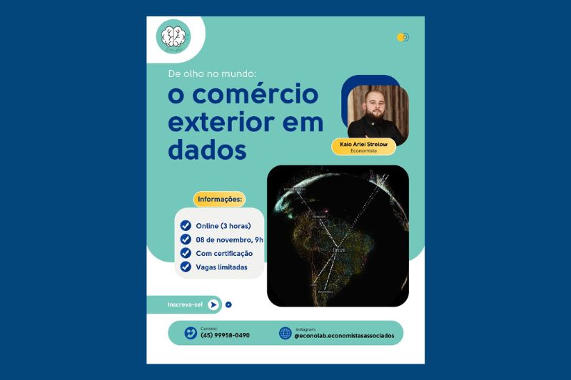 Com um mercado global cada vez mais interconectado, a capacidade de interpretar dados de comércio exterior tornou-se uma habilidade estratégica para empresas e profissionais. Para capacitar interessados nesse tema, o economista Kaio Arlei Strelow realizará o evento online “De Olho no Mundo: o Comércio Exterior em Dados”, no dia 08 de novembro (sábado), a partir das 9h da manhã, de forma remota pela plataforma Zoom.