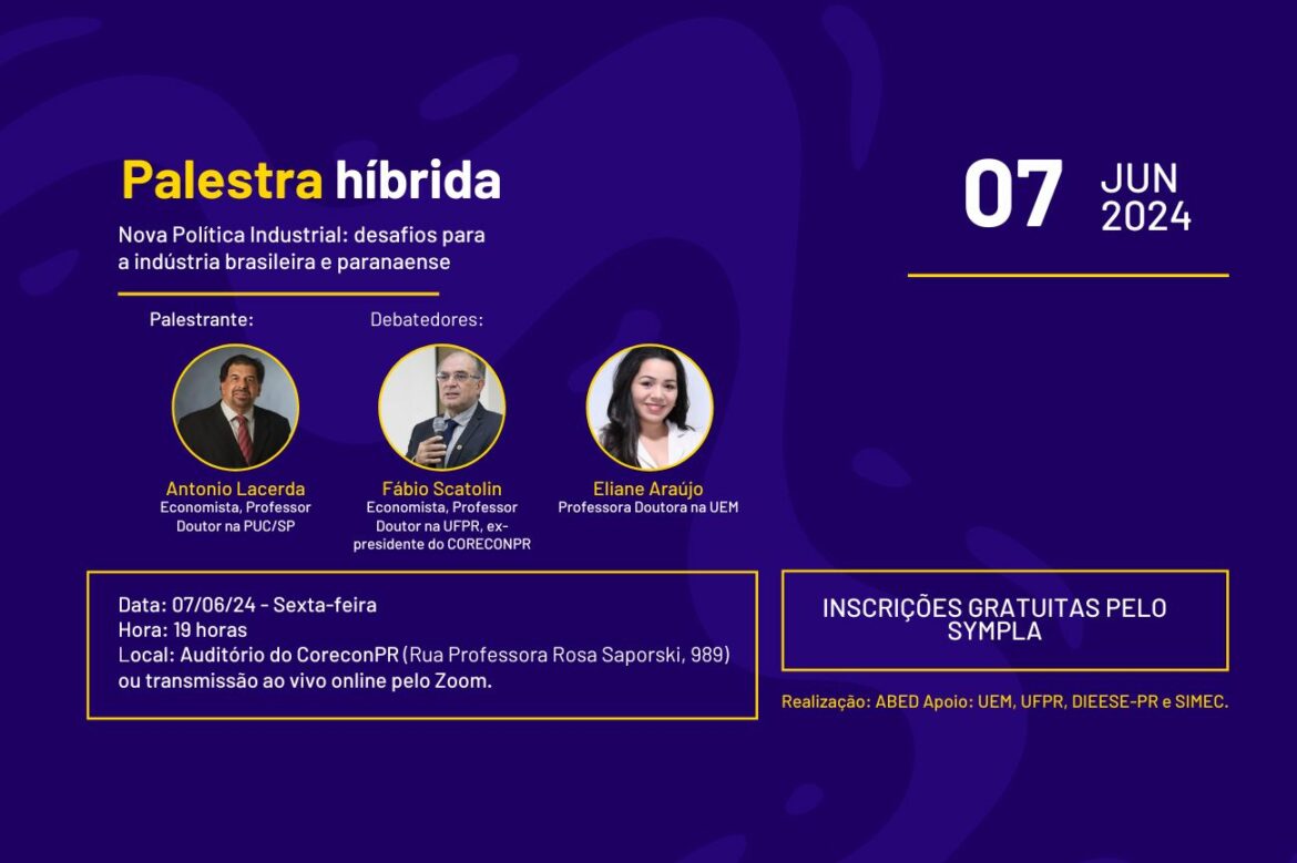 O evento terá como palestrante Antonio Lacerda, Economista e Professor Doutor na PUC/SP, e como debatedores Fábio Scatolin, Economista, Professor Doutor na UFPR e ex-presidente do CoreconPR, e Eliane Araújo, Professora Doutora na UEM.